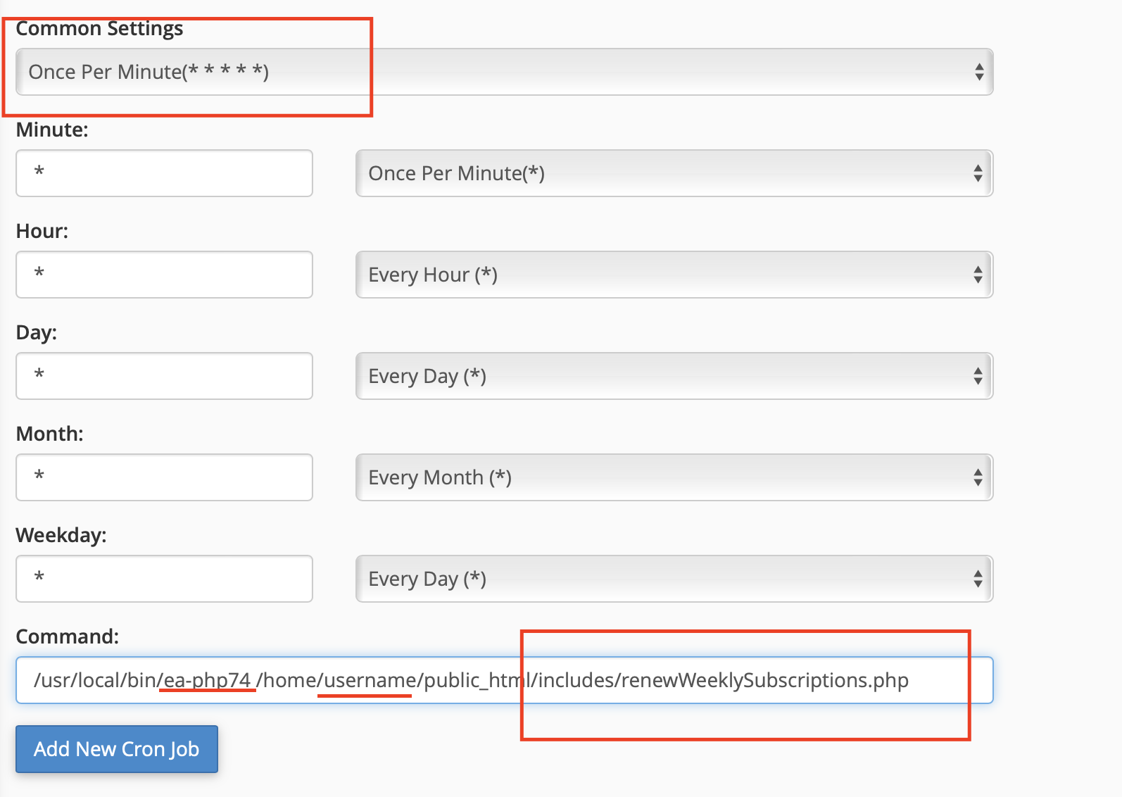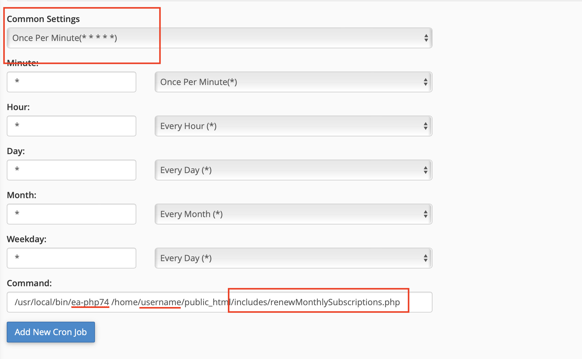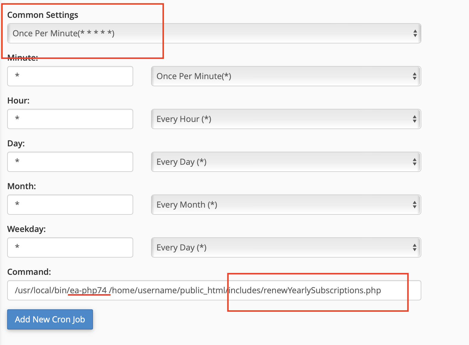 In the image above change ea-php74 for your PHP version, username for yours, and put the path where your project is located, in my case it is in public_html.