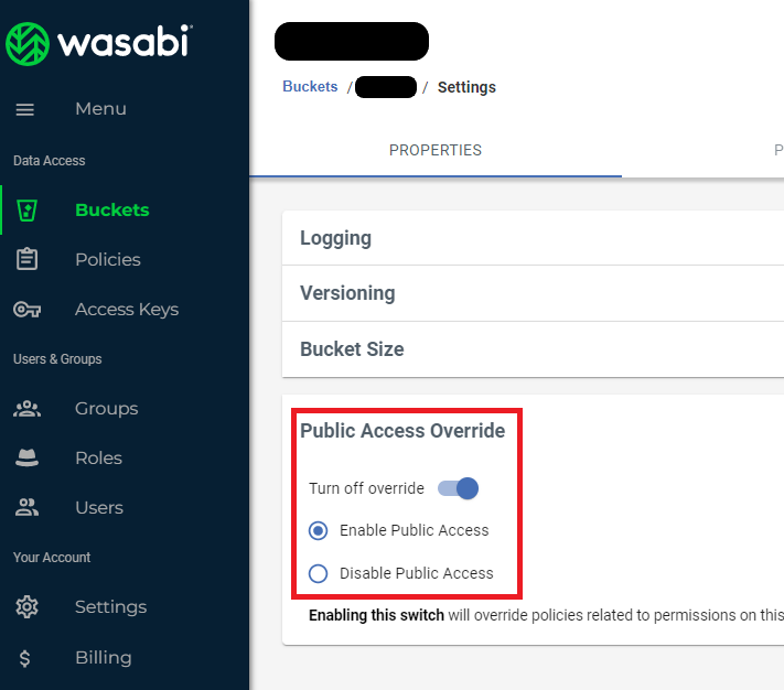 Step 4: In the Settings page, make sure you Enable Public Access for this bucket.