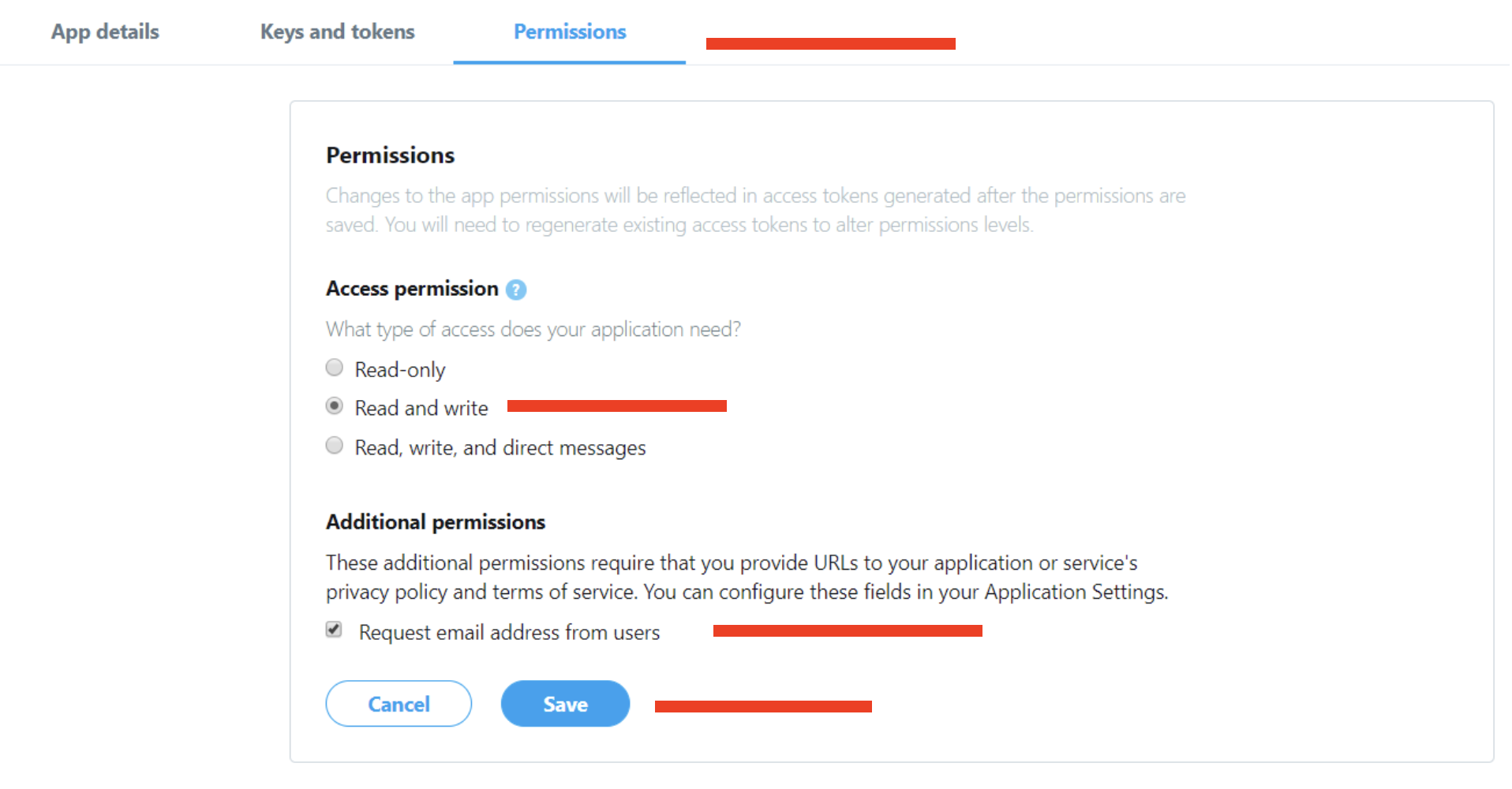 Change the apps permission to Read and Write or Read, Write and Access direct messages. For changing the apps permission, you need to add a mobile number to your twitter account.